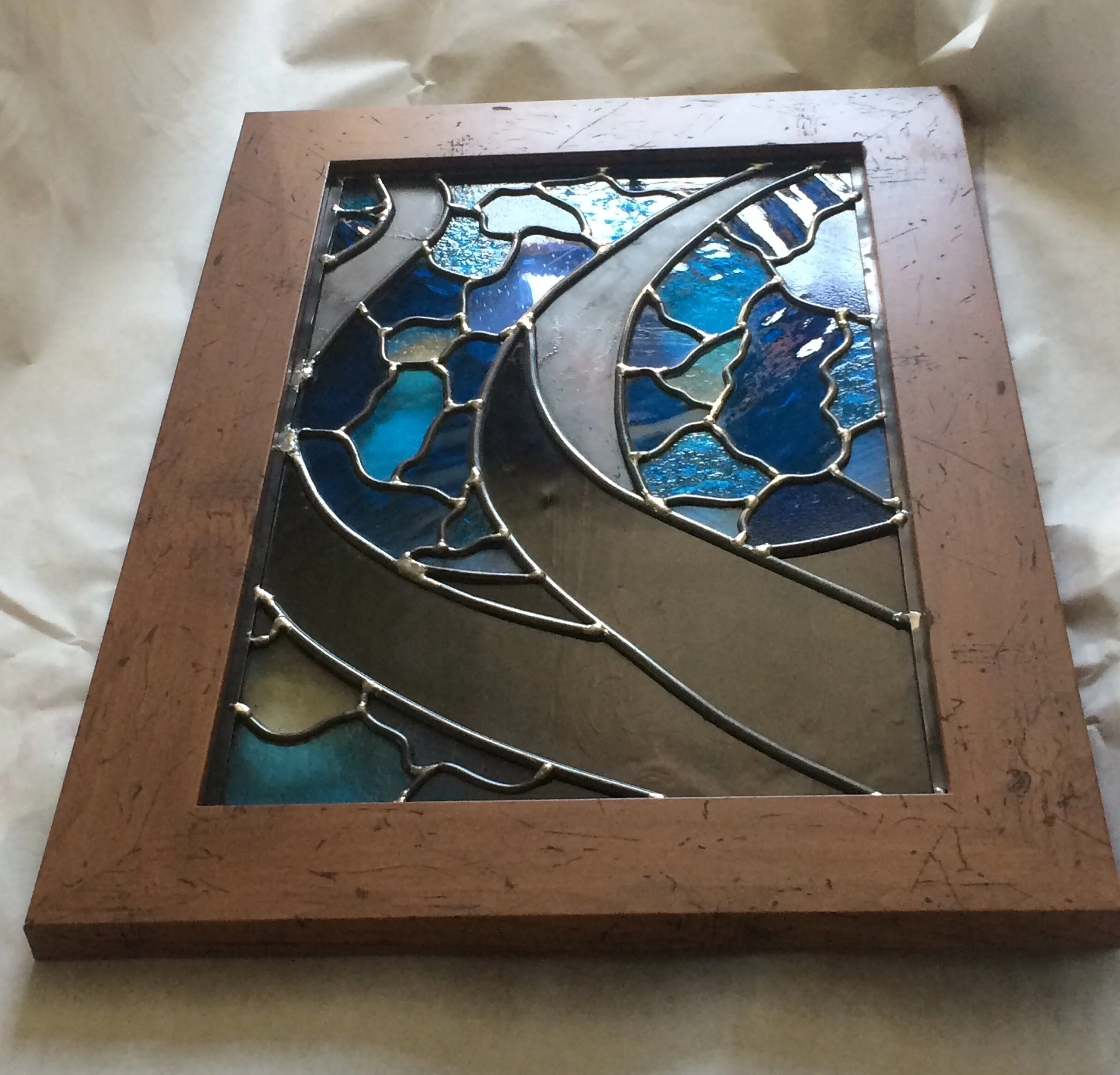 Created on mouth-blown glass, painted with lead oxide, windex, this window was leaded in the traditional stained glass fashion and framed in cherry.